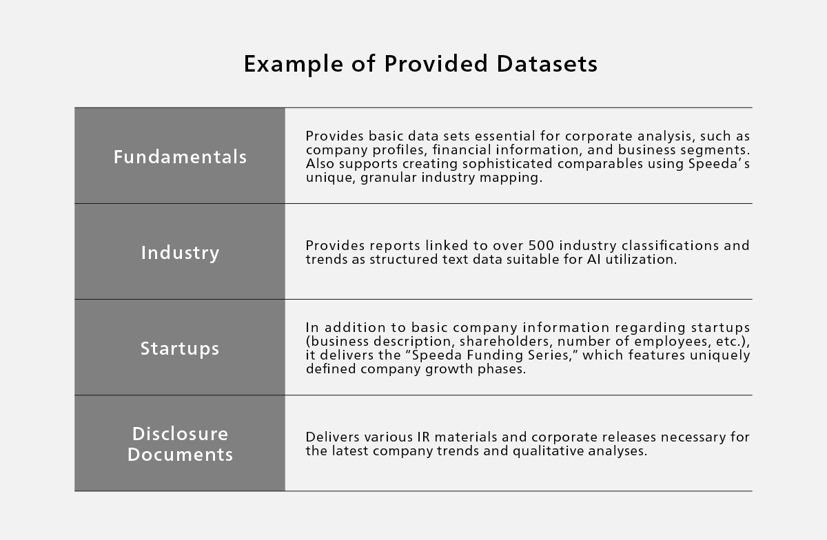 Uzabase provides a dataset of over 20 diverse categories of market intelligence, ranging from foundational quantitative data, such as company profiles, financials, and stock information, to high-value qualitative insights, including proprietary industry reports by Uzabase analysts and startup ecosystem trends.