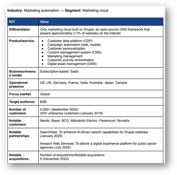 Quickly surface startups for acquisition or partnership, with insights into their drivers, differentiators, and go-to-market details.
